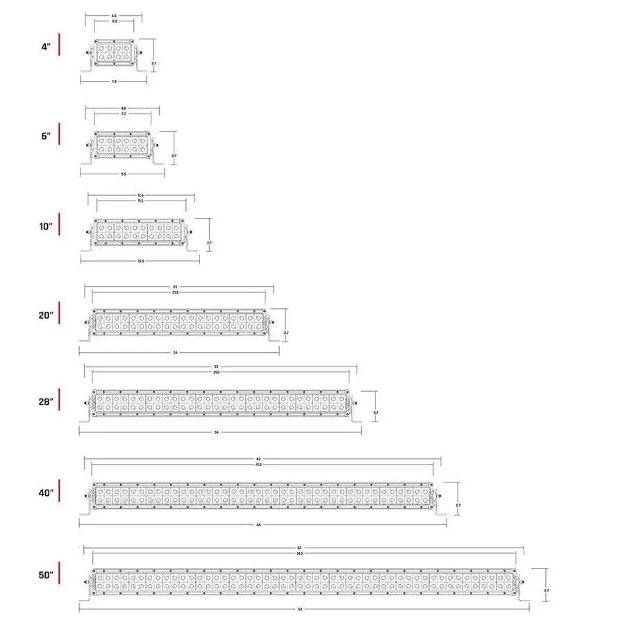 The E-Series is one of RIGID's most versatile, all-around lighting solutions, and recent enhancements in LED technology delivering up to 111% more raw lumens than ever before with the E-Series PRO. Among RIGID's most popular product lines, the E-Series PRO has recently benefited from several upgrades to improve both looks and performance. Plus, branding and blacked-out circuit boards give the E-Series PRO a more refined look. Available with your choice of optics, the E-Series features a host of beam options, including Spot, Flood, Driving, Hyperspot, Diffused, and Driving/Spot and Spot/Hyperspot combinations. These and other innovations make it one of the brightest and most efficient LED light bars on the market. The E-Series was born in off-road, but its versatility makes it well suited for use with power sports, marine, general automotive and even first responder applications.
